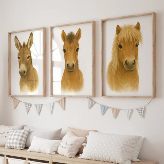 Horse & Donkey Print Set - Nursery Farmyard Animal Collection Set of 3