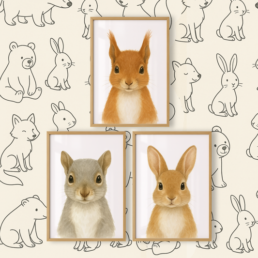 Red Squirrel, Grey Squirrel & Rabbit - Woodland Nursery Print Set of 3