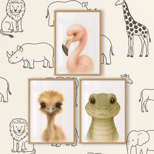 Flamingo, Ostrich & Crocodile - Safari Nursery Print Set of 3