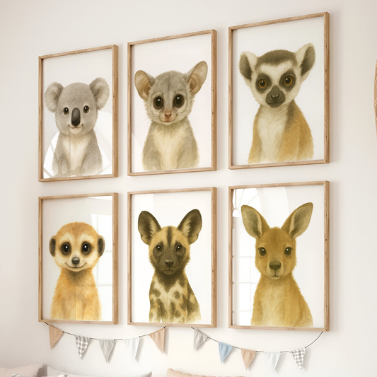 Koala, Bush Baby, Lemur, Meerkat, African Dog & Kangaroo - Safari Nursery Print Set of 6