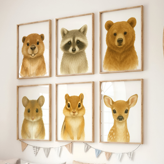 Beaver, Racoon, Bear, Mouse, Chipmunk & Deer - Woodland Nursery Print Set of 6